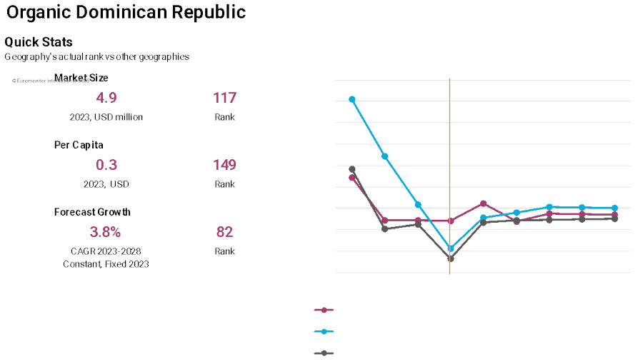 • The Dominican Republic’s Organic market remains small, ranking 19th in Latin America and 117th globally, with a market value of US$4.9 million in 2023. The country is also among the lowest in per capita consumption, ranking as the seventh smallest in Latin America. Looking ahead, the market is expected to grow at a constant CAGR of 3.8% over the forecast period, outperforming the Latin American average.