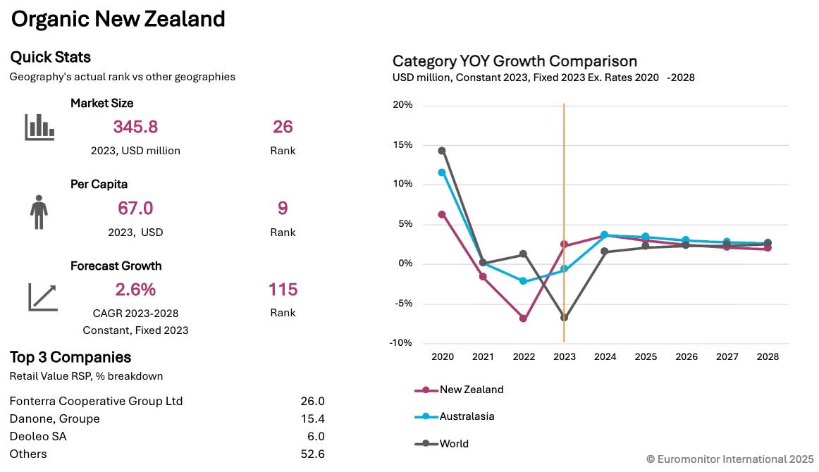 • The Organic Packaged Food and Beverages category in New Zealand registered growth of 8.3% in 2023 in current prices to record a market size of US$345.8 million.