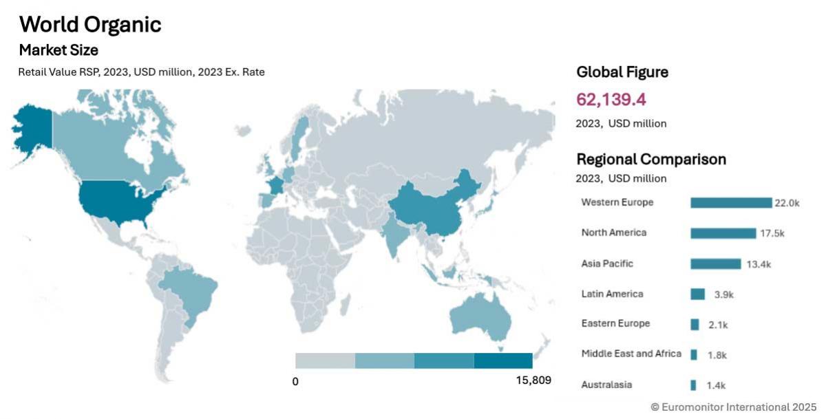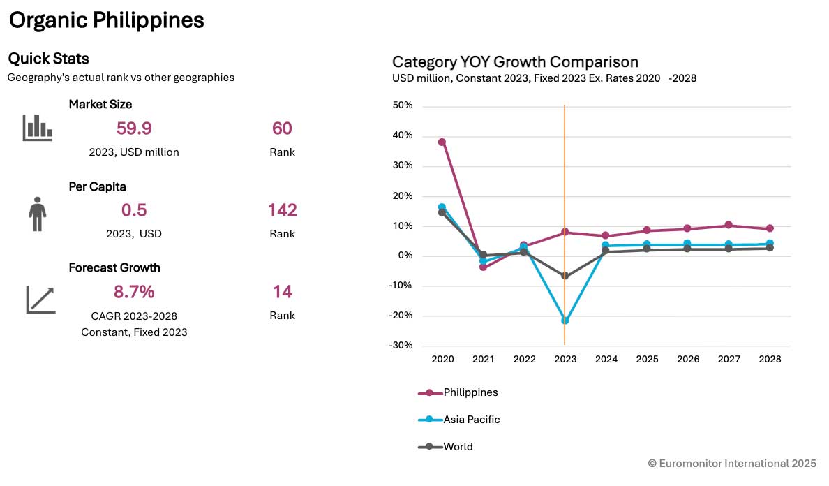 • Organic products in the Philippines represent roughly 0.1% of global demand and just 0.4% of the market in the Asia Pacific region, recording a per capita expenditure of US$0.5 in 2023.