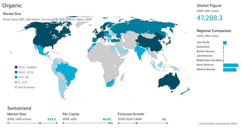 • Depending on the country, such products are called ‘organic’, ‘biological’ or ‘ecological’: For organic products to be included under Euromonitor definitions, the organic aspect needs to form part of positioning/marketing of the product. This is an aggregation of organic baby food, bakery, confectionery, dairy, ice cream, oils and fats, ready meals, rice, sauces, dressings and condiments, snack bars, soups, spreads, sweet and savory snacks and other organic food.