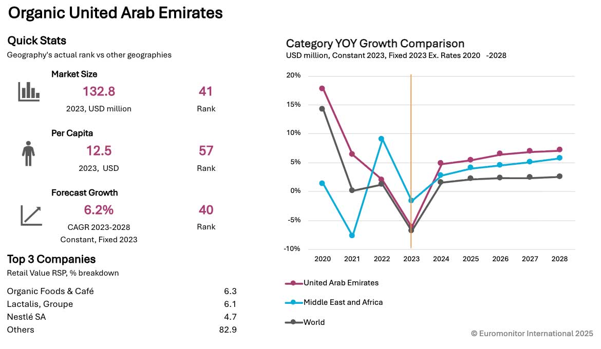 • Organic products in the UAE represent 0.2% of global demand and 7.4% of the market in the Middle East and Africa region, recording a per capita expenditure of US$12.5 in 2023.