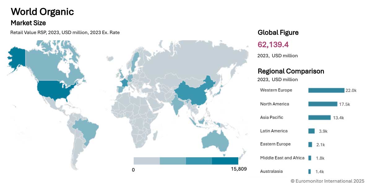 • Depending on the country, such products are called "organic," "biological," or "ecological": For organic products to be included under Euromonitor definitions, the organic aspect needs to form part of positioning/marketing of the product. This is an aggregation of organic baby food, bakery, confectionery, dairy, ice cream, oils and fats, ready meals, rice, sauces, dressings and condiments, snack bars, soups, spreads, sweet and savory snacks, and other organic food.
