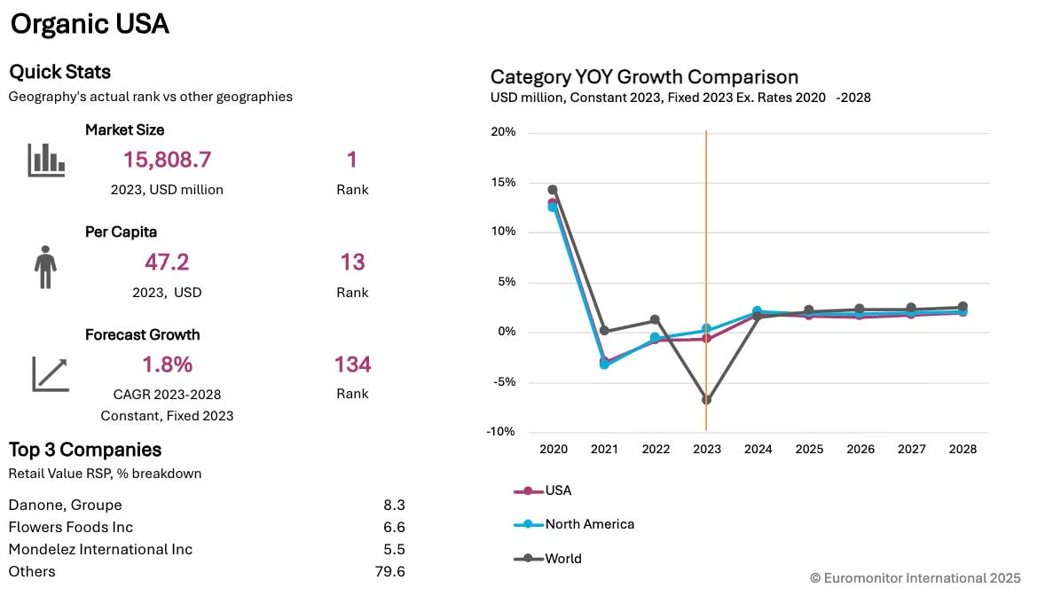 • The US remains the largest organic market globally by a significant margin, with a value of US$15.8 billion in 2023. Nonetheless, it lags behind several European countries in terms of per capita consumption.